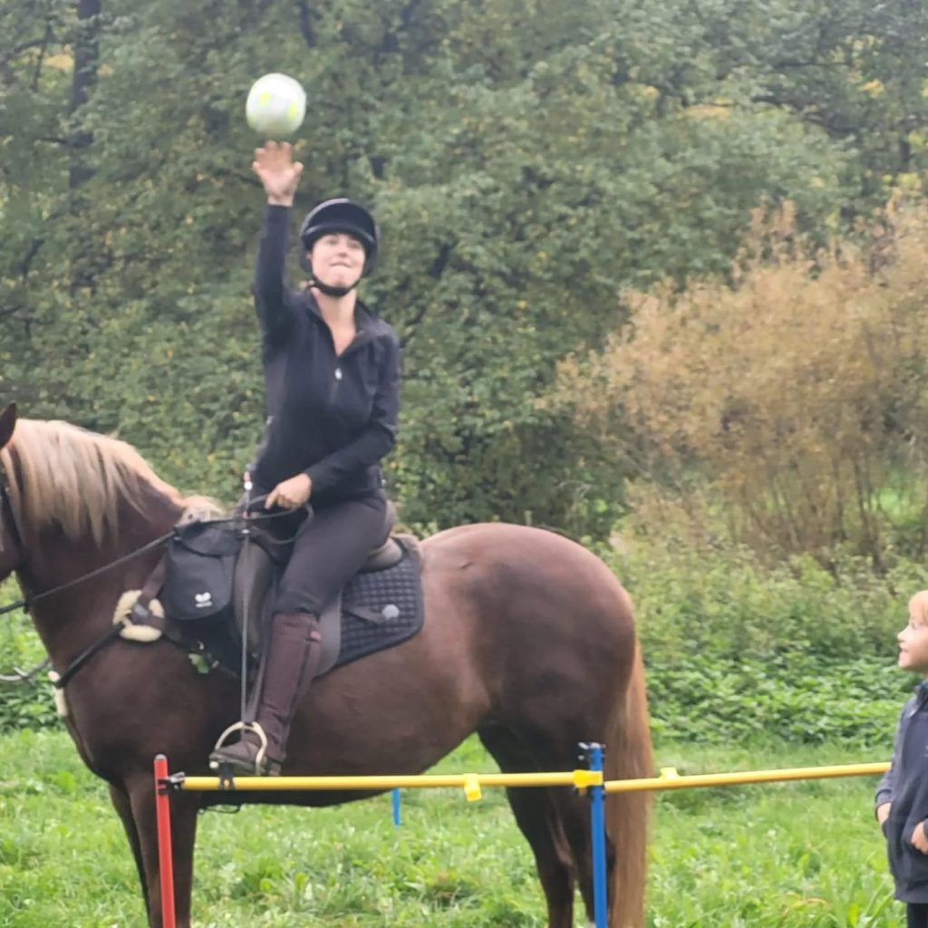 Nach einem kurzen Ritt durch den Wald kamen die Paare zur ersten Station. Hier mussten die Reiter nicht nur Wurfgeschick mit dem Ball beweisen, sondern auch Treffsicherheit. So war Teil der Aufgabe mit dem Pferd in die Furt zu reiten und mit einem Eimer Wasser zu holen. Dieses Wasser musste dann in einen anderen Eimer geleert werden und das natürlich allem hoch zu Ross.